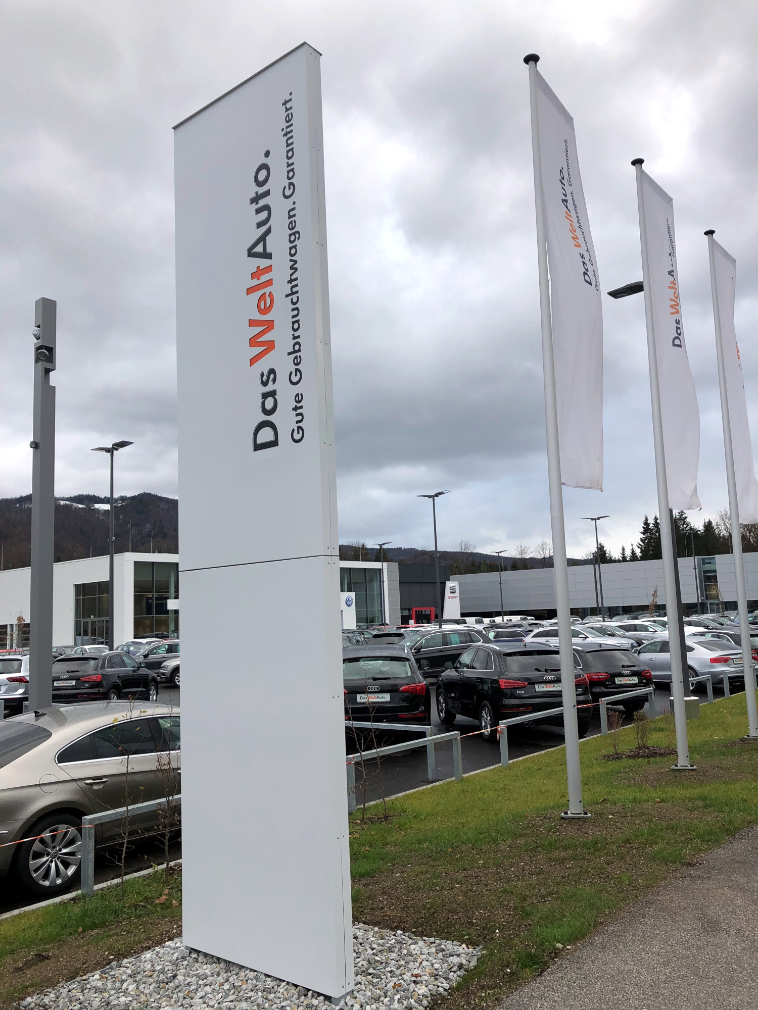 Freistehendes Portal und Pylon zur besseren Erkennbarkeit des Marktplatzes für Premium-Gebrauchtwagen