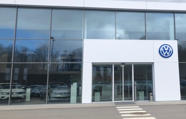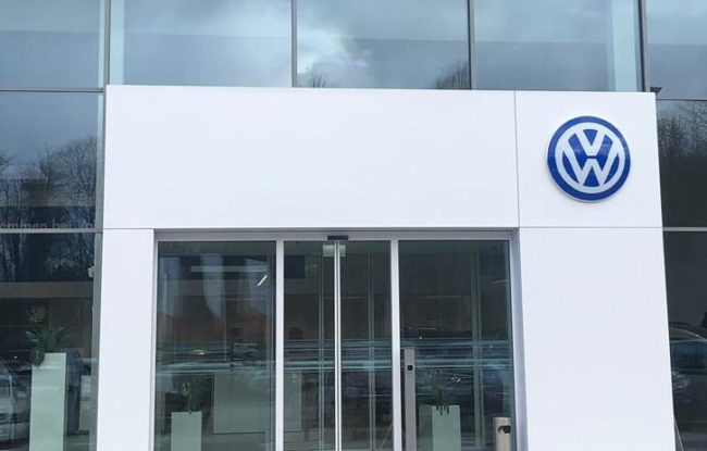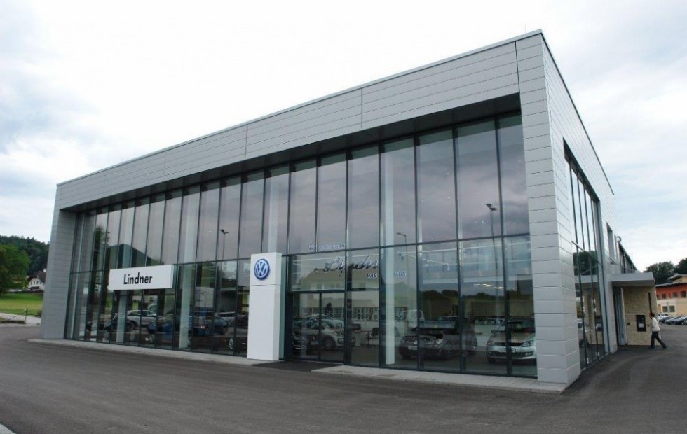 Leistungsumfang: Eingangsportal fassadenintegriert, Händlername, Gebäuderahmen inkl. LED Beleuchtung …VW Lindner Wals, Österreich