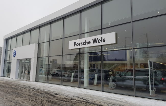 Leistungsumfang: Eingangsportal fassadenintegriert, Händlername, Gebäuderahmen …VW Porsche Vogelweiderstraße, Österreich